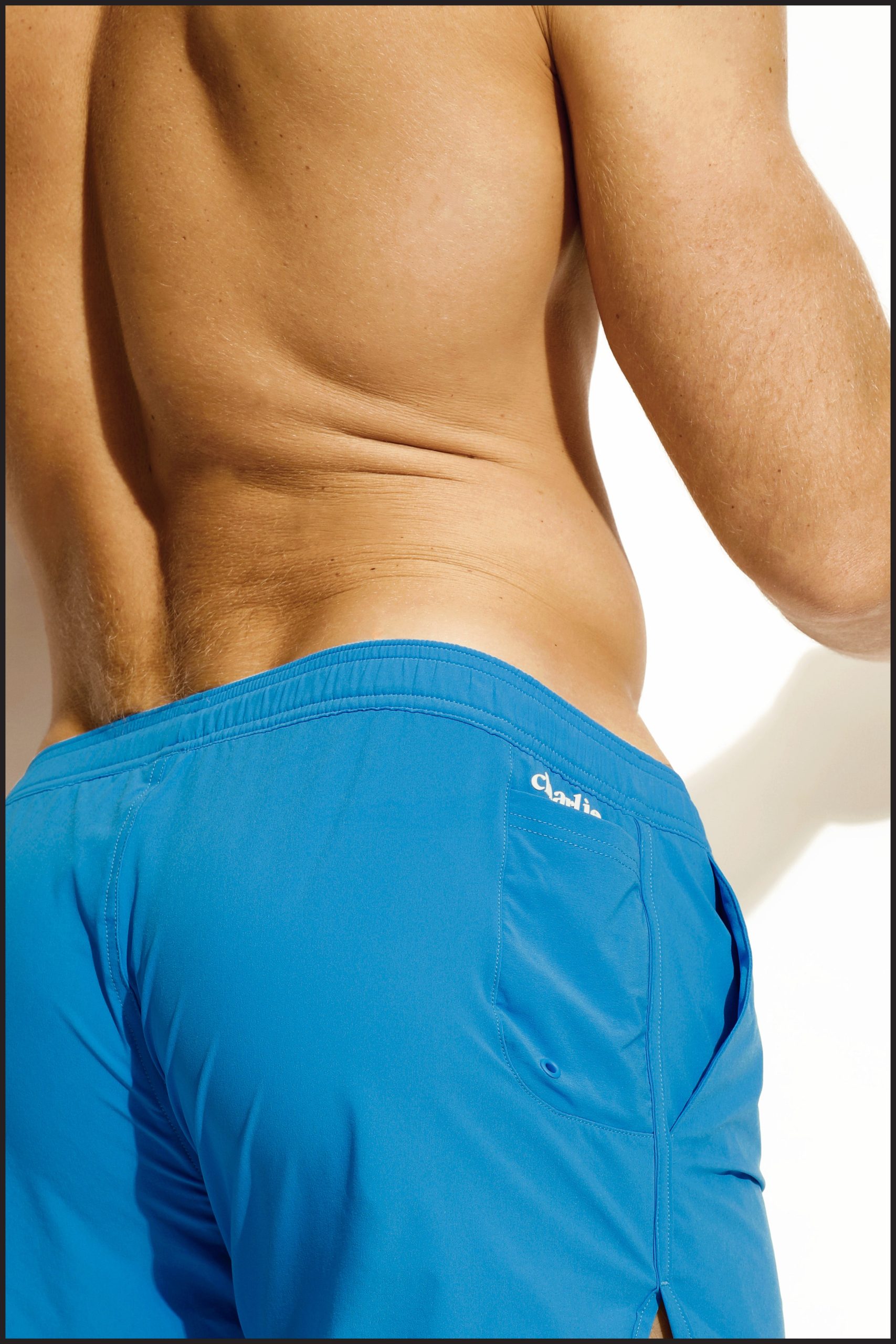 Charlie by Matthew Zink Pool Beach Short Swimwear. Pool Blue Beach Short has two side pockets. left hip-security pocket with invisible zipper. drawstring waistband. and right hip-cell phone pocket. Brief Liner.