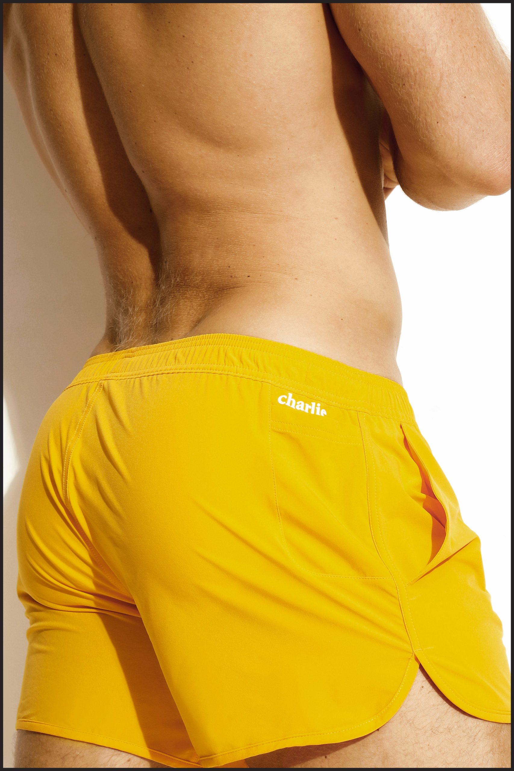 Charlie by Matthew Zink Yellow Beach Short Swimwear. The Beach Short has two side pockets. left hip security pocket with invisible zipper. drawstring waistband. and right hip cell phone pocket. Brief Liner