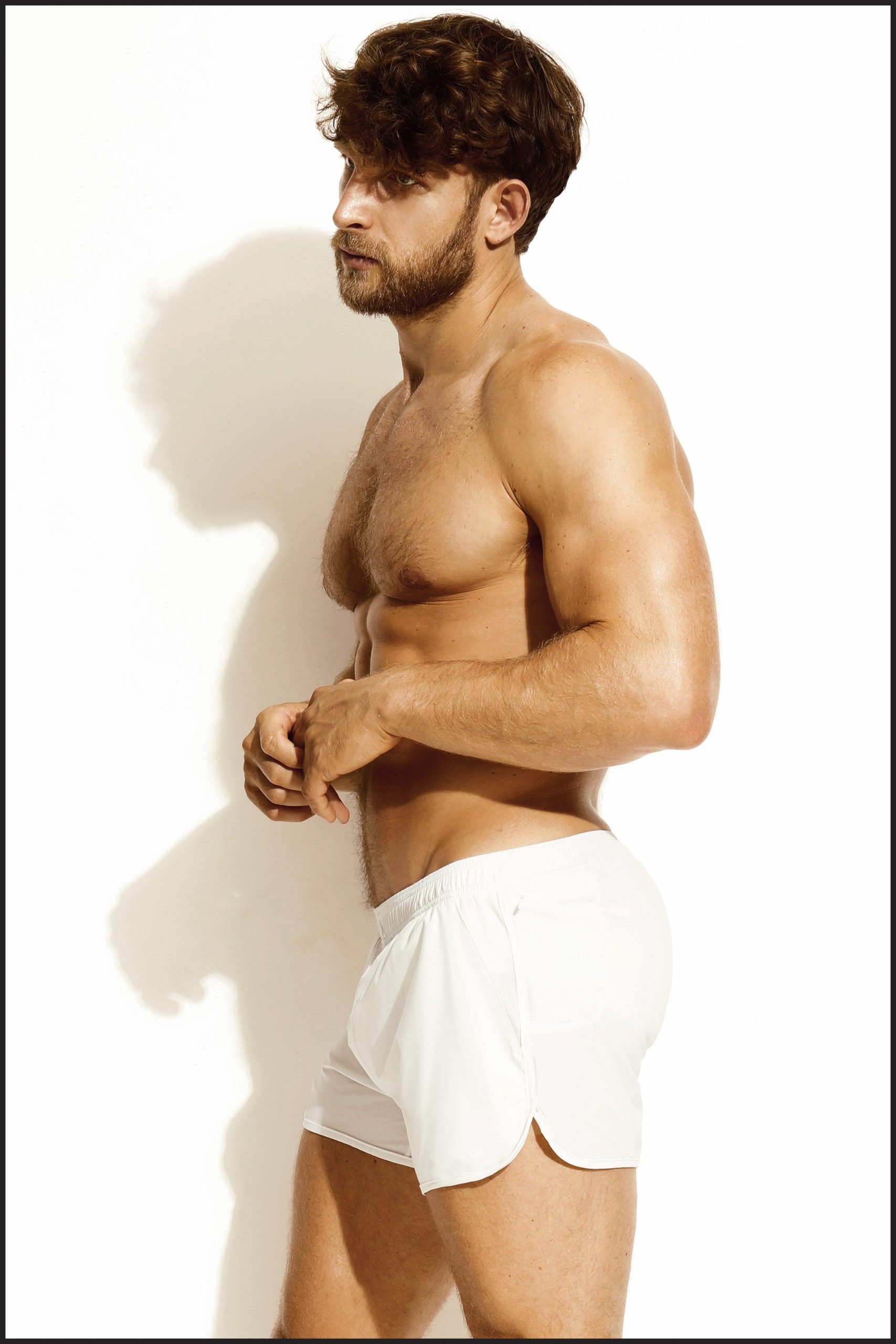 Charlie by Matthew Zink White Beach Short Swimwear. White Short has two side pockets. left hip security pocket with invisible zipper. drawstring waistband. and right hip cell phone pocket. Brief Liner