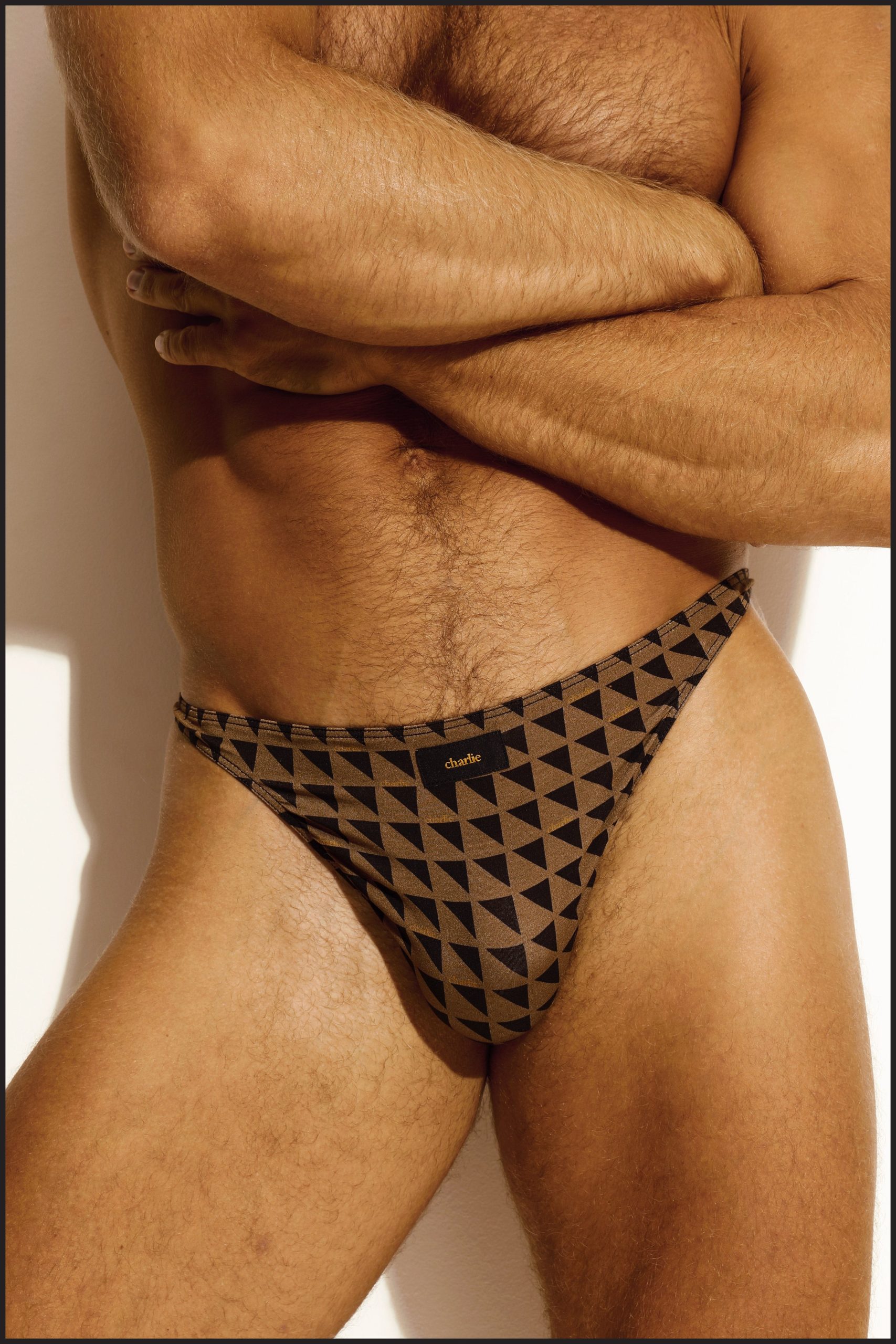 Charlie by Matthew Zink Cafe Icon Geo printed High-Cut Boomerang Thong. High-cut leg with a shaped thong back panel and black Charlie label. Single-layer front pouch.