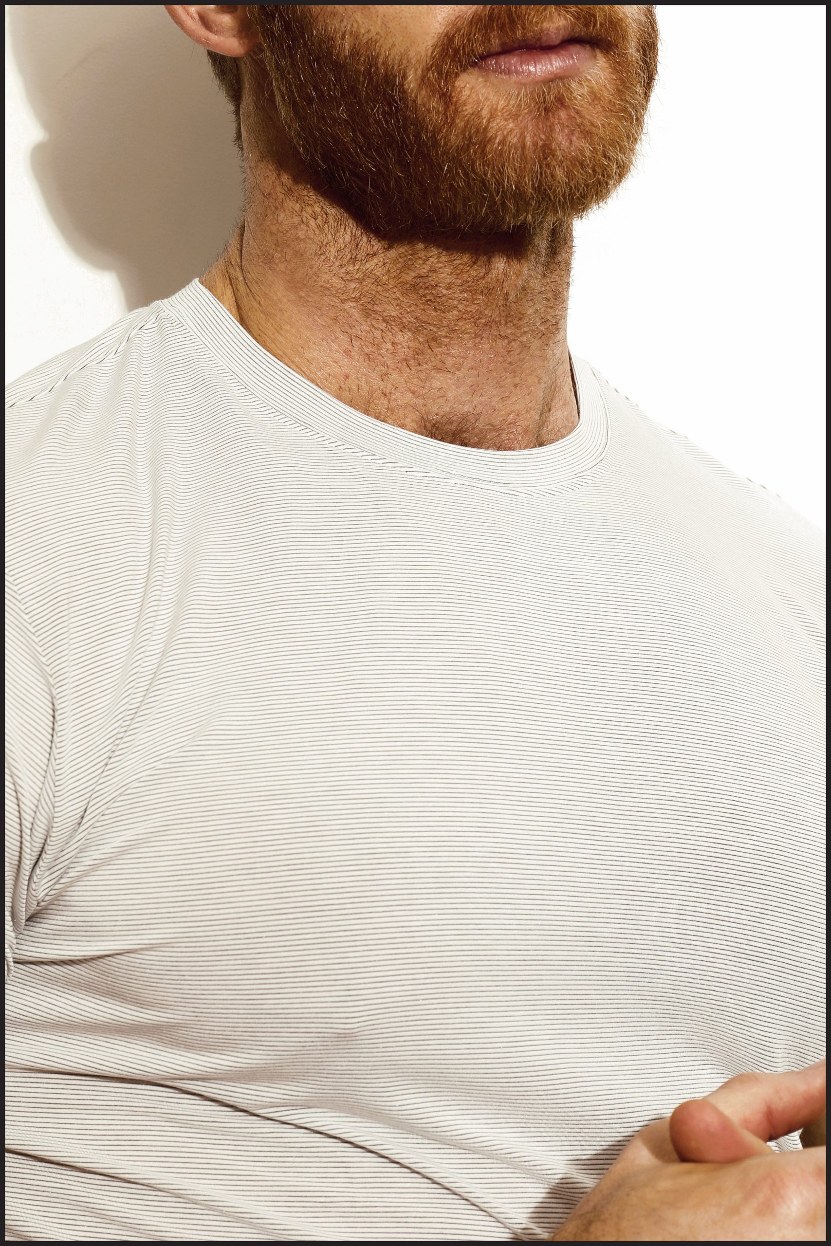 White Micro Stripe Charlie micromodal Classic Tee Shirt.?Tee Shirt has shaped?shirt tail hem.?
