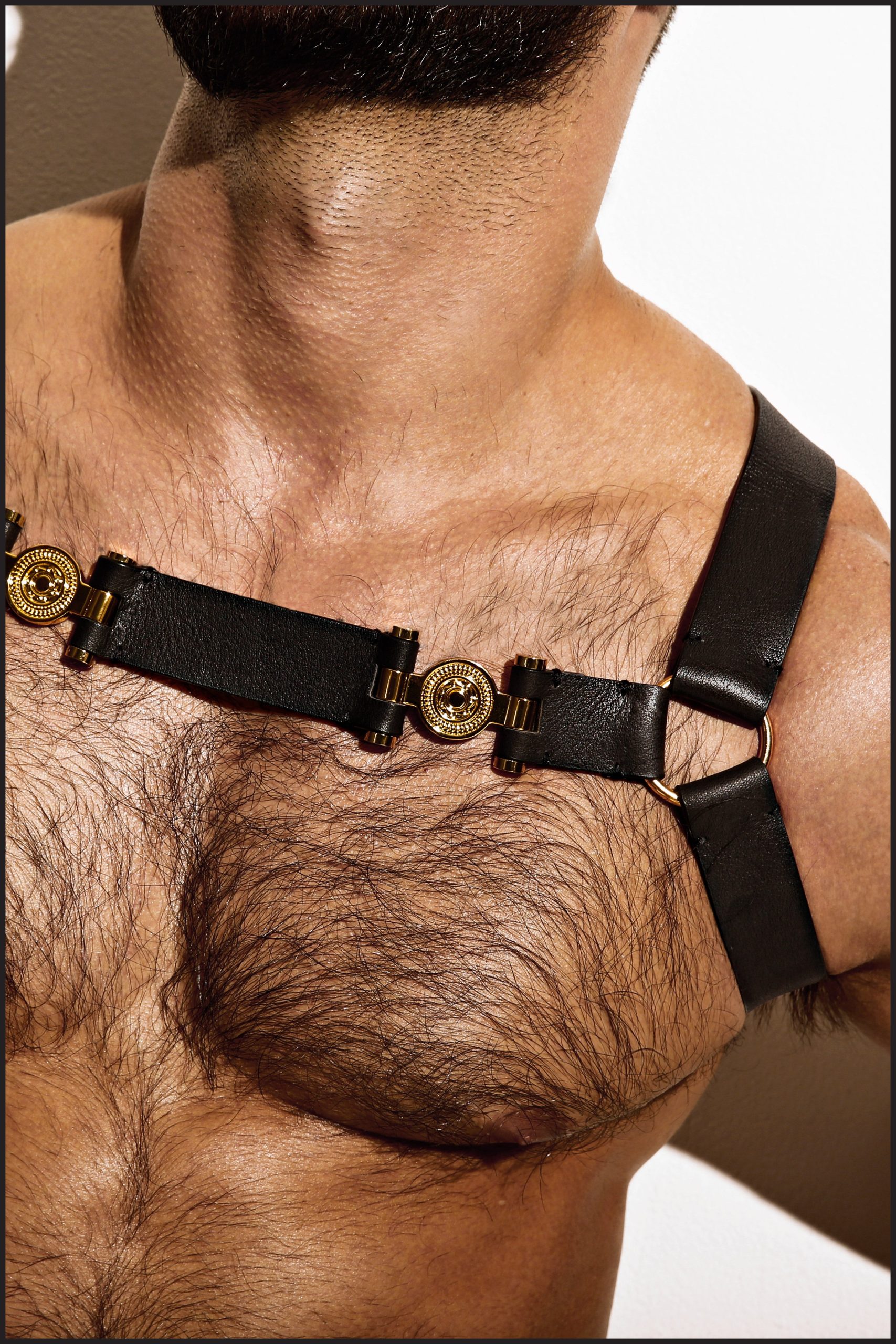 Adjustable Genuine Leather Chest Harness with gold hardware and 1 1/8 straps.