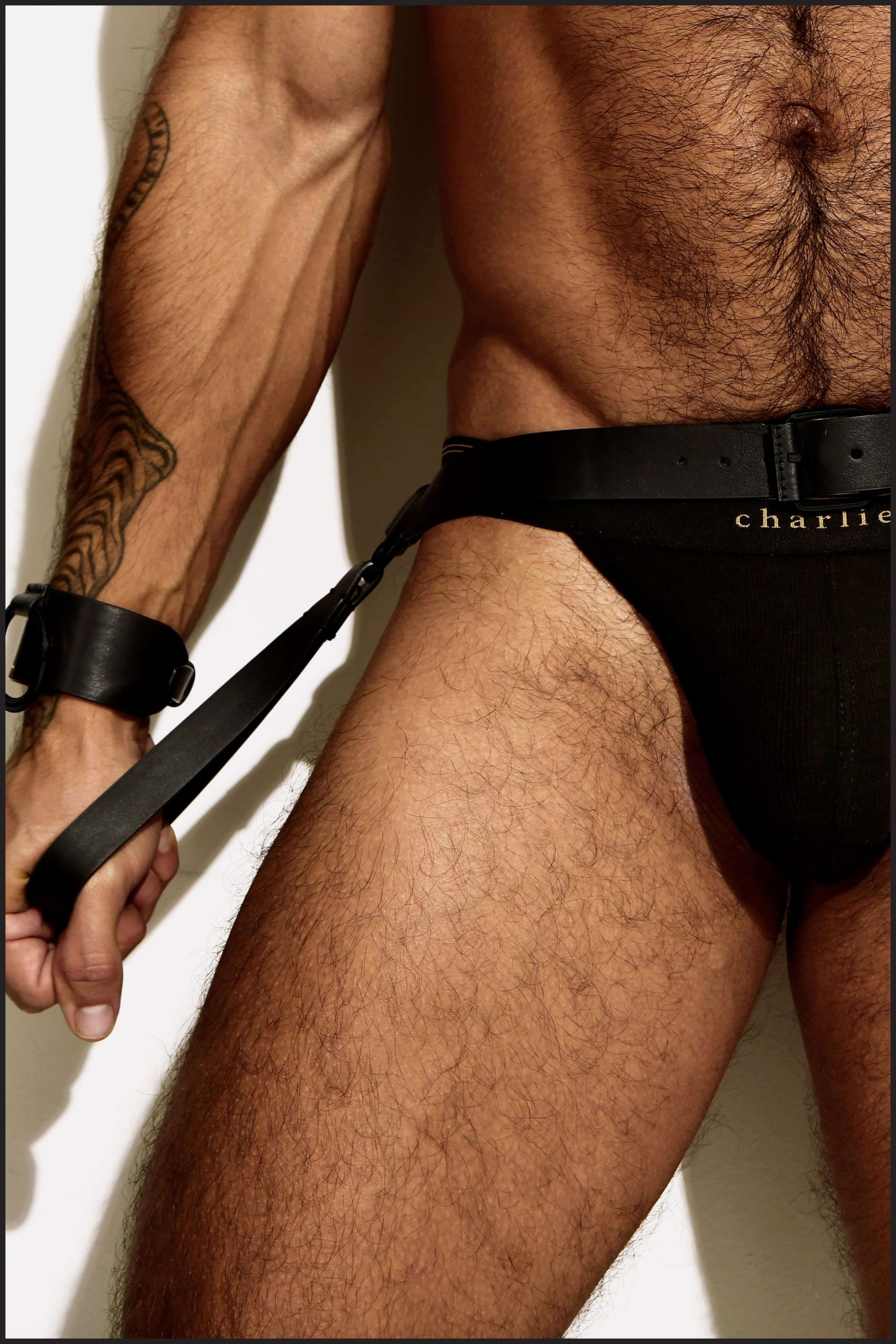 Adjustable Genuine Leather Belt Harness with matte black hardware and 1 1/8 straps. Hand inked edges