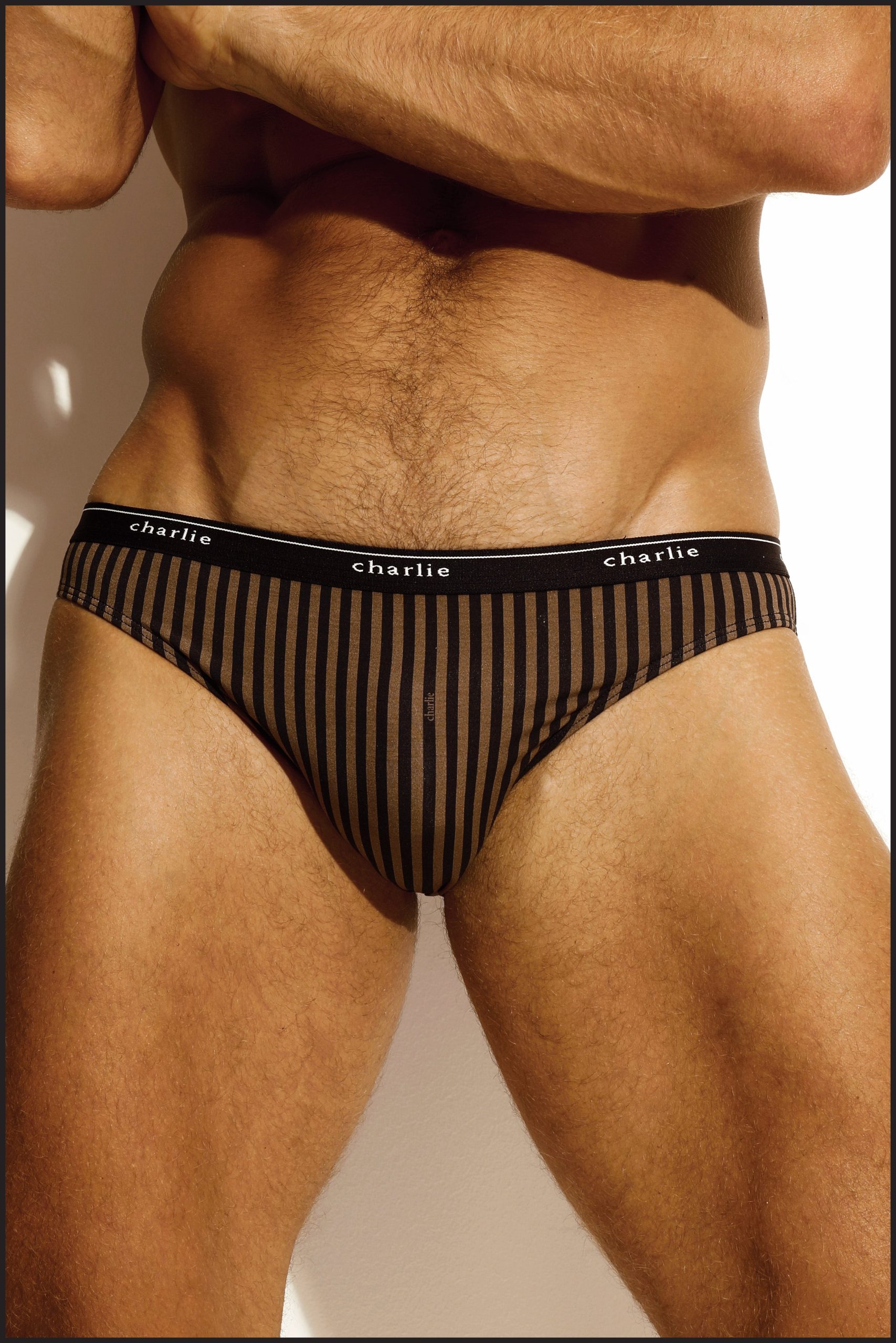 Charlie by Matthew Zink Icon Stripe printed Minimal Bikini Brief with 2 cm logo waistband. Single layer front pouch.