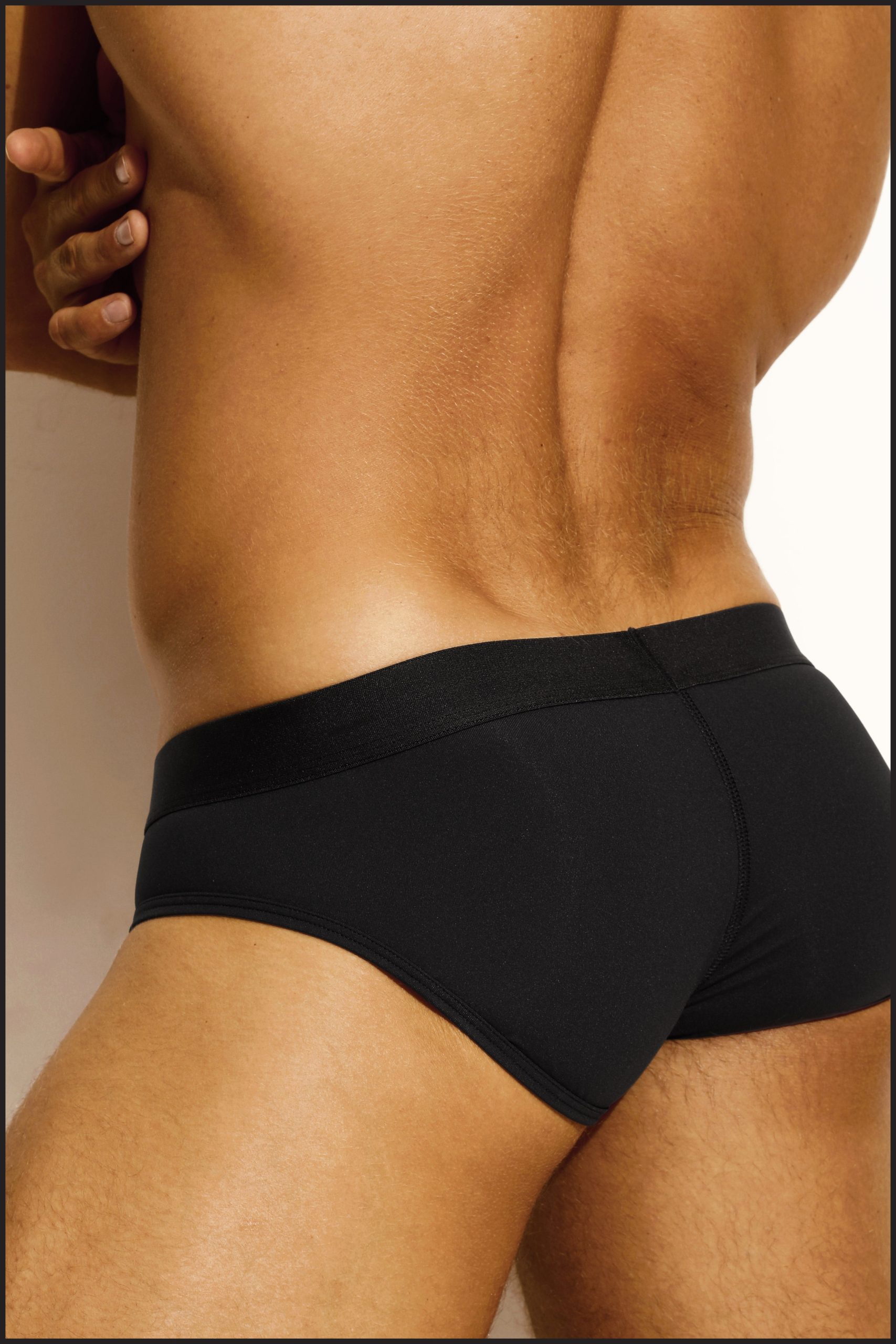 Charlie by Matthew Zink black?micromodal?Fitness?Classic Brief with back panel Glute Seaming. front?MVP?Pouch Seaming. 1 1/4 waistband and black label.?Our signature MatteLuxe circular knit fabric is beautifully soft and lightweight for a fit and feel you need to experience to believe. With 14% elastic. this collection offers maximum room and comfort.?Single layer front pouch.