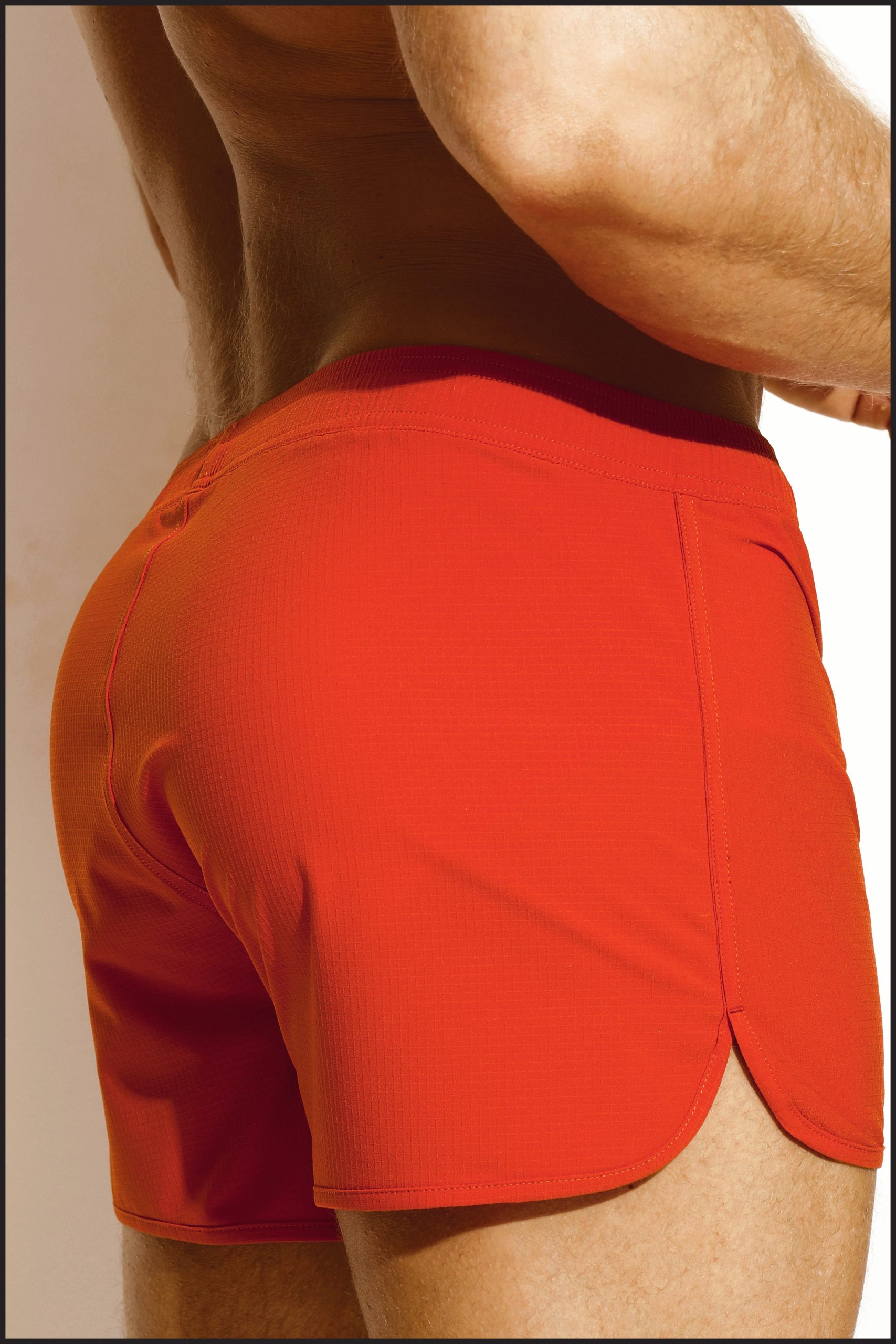 Charlie by Matthew Zink Tomato Red Court Short made in custom Italian stretch ripstop fabric.? Drawstring waistband. and brief Liner.? This is the same fit as our Beach Short made without pockets. This lightweight short is perfect as swimwear. for any nature adventure. or at the gym.