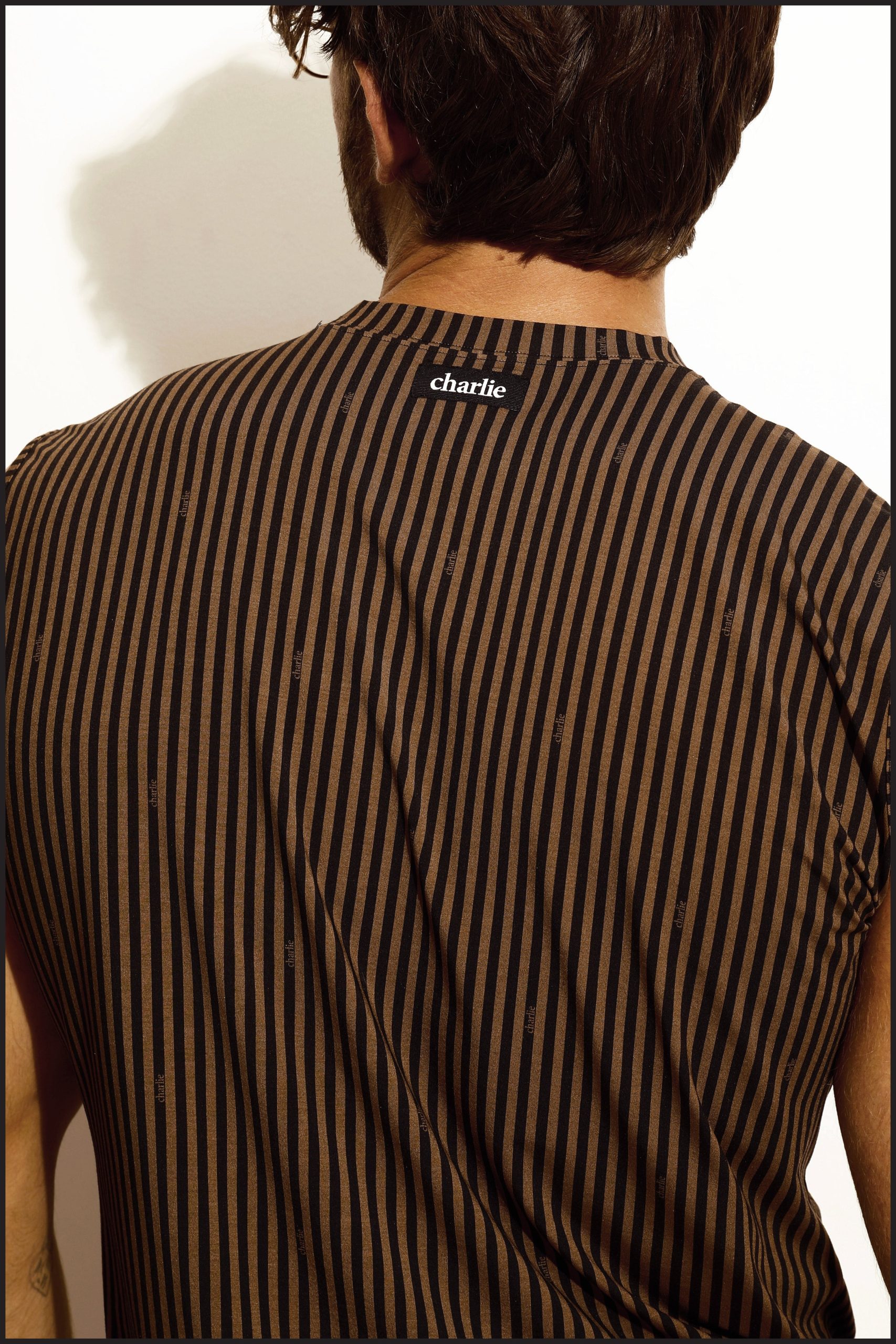 Charlie by Matthew Icon Stripe printed Sleeveless Tee Shirt with a shaped. shirt tail hem and black Charlie label.