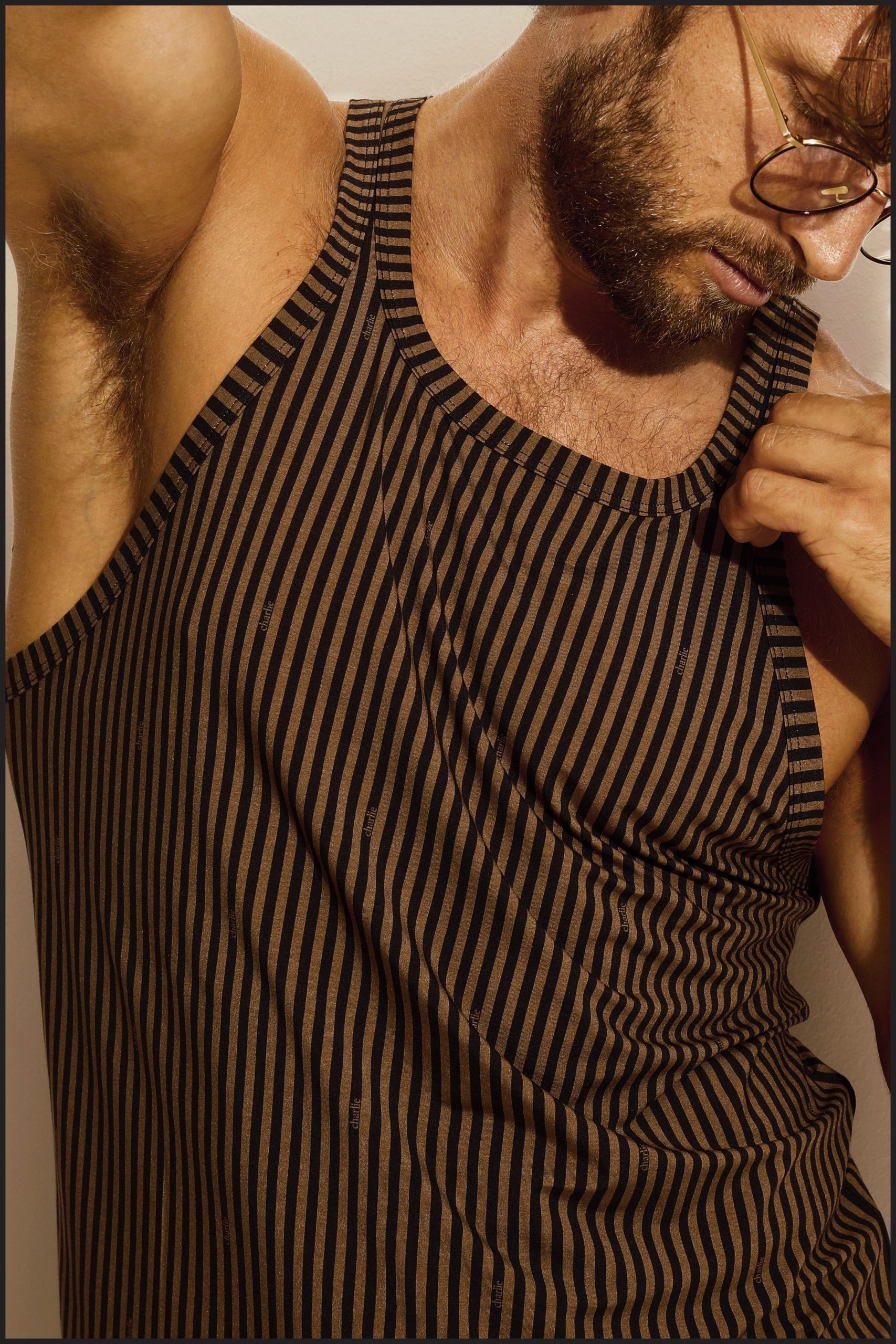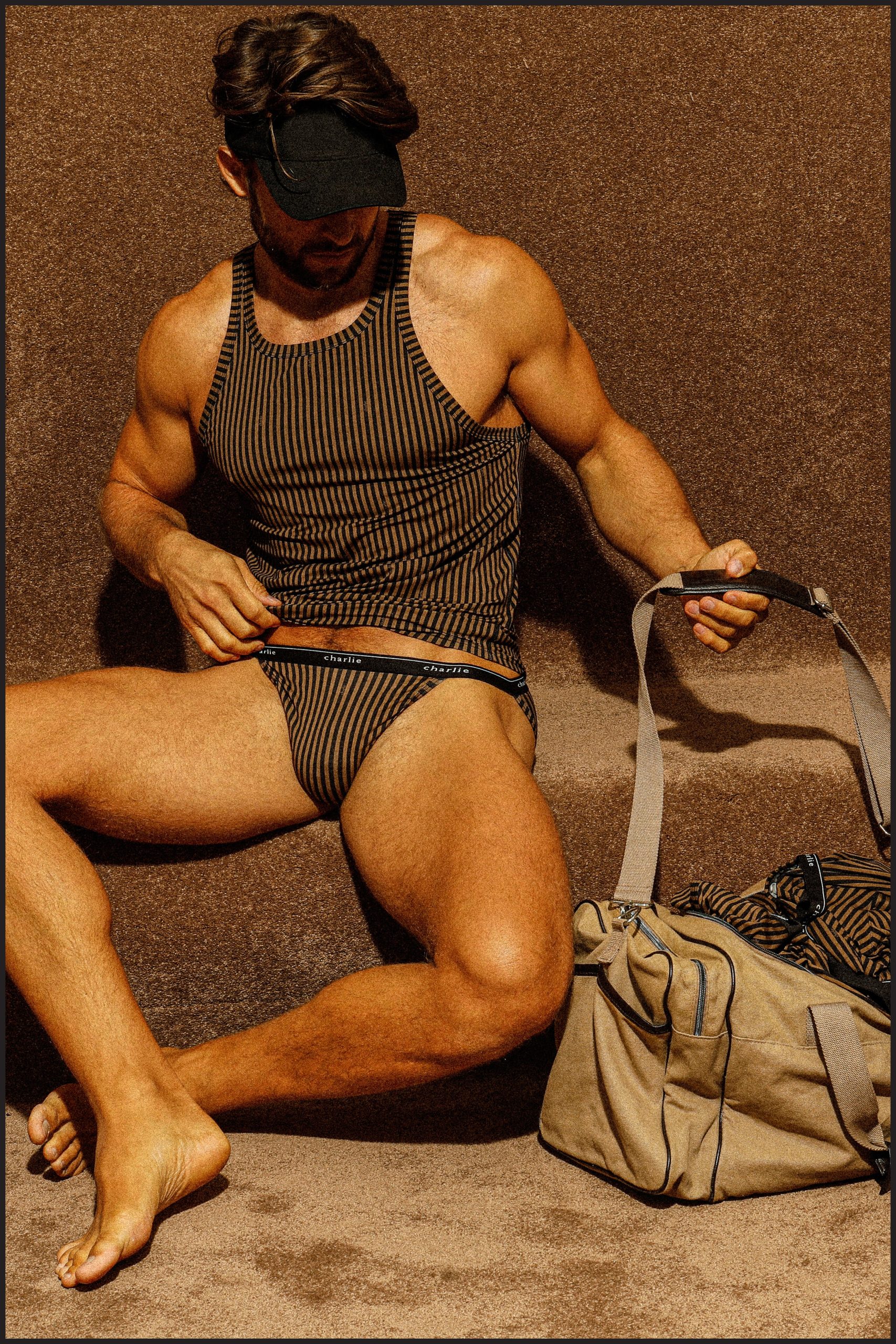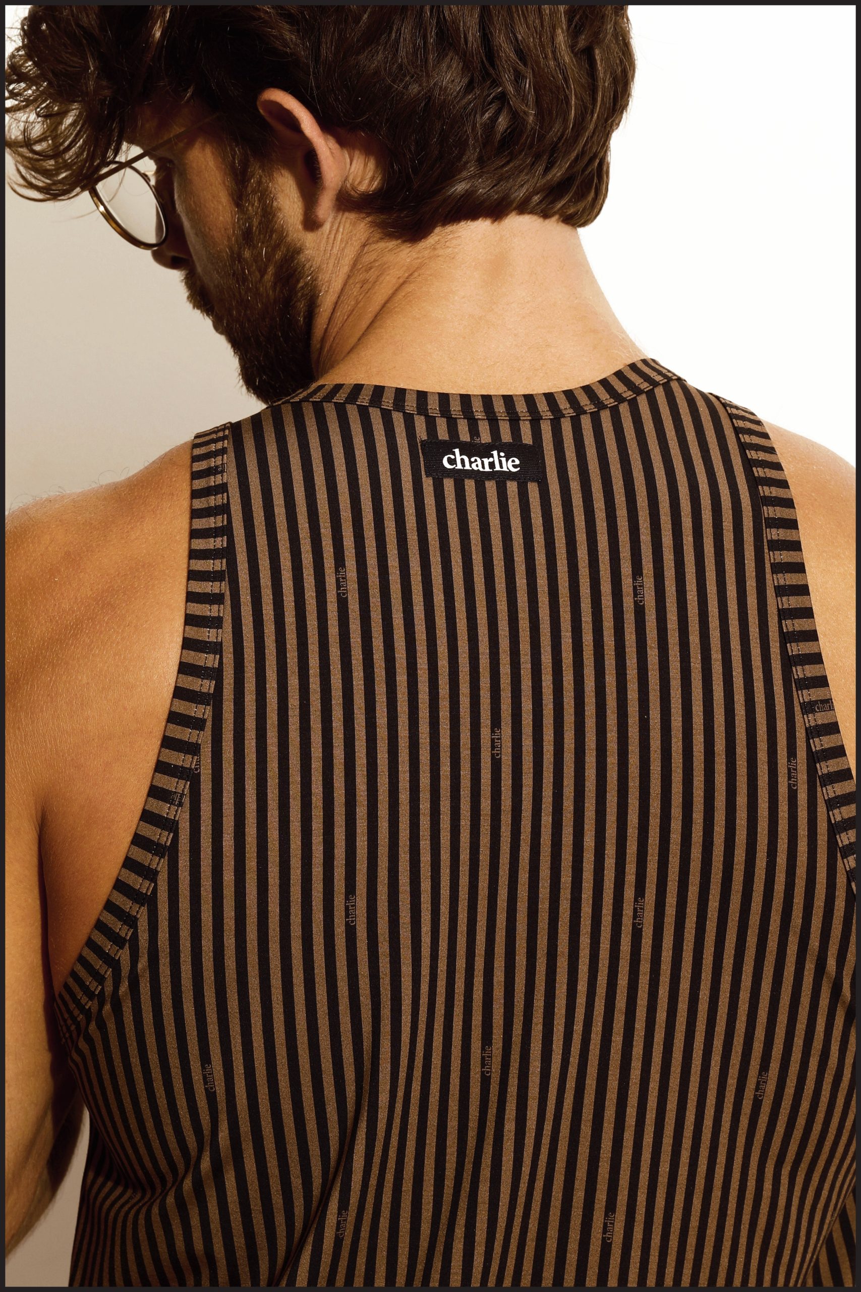 Charlie by Matthew Icon Stripe printed Sport Tank with a shaped. shirt tail hem and black Charlie label.
