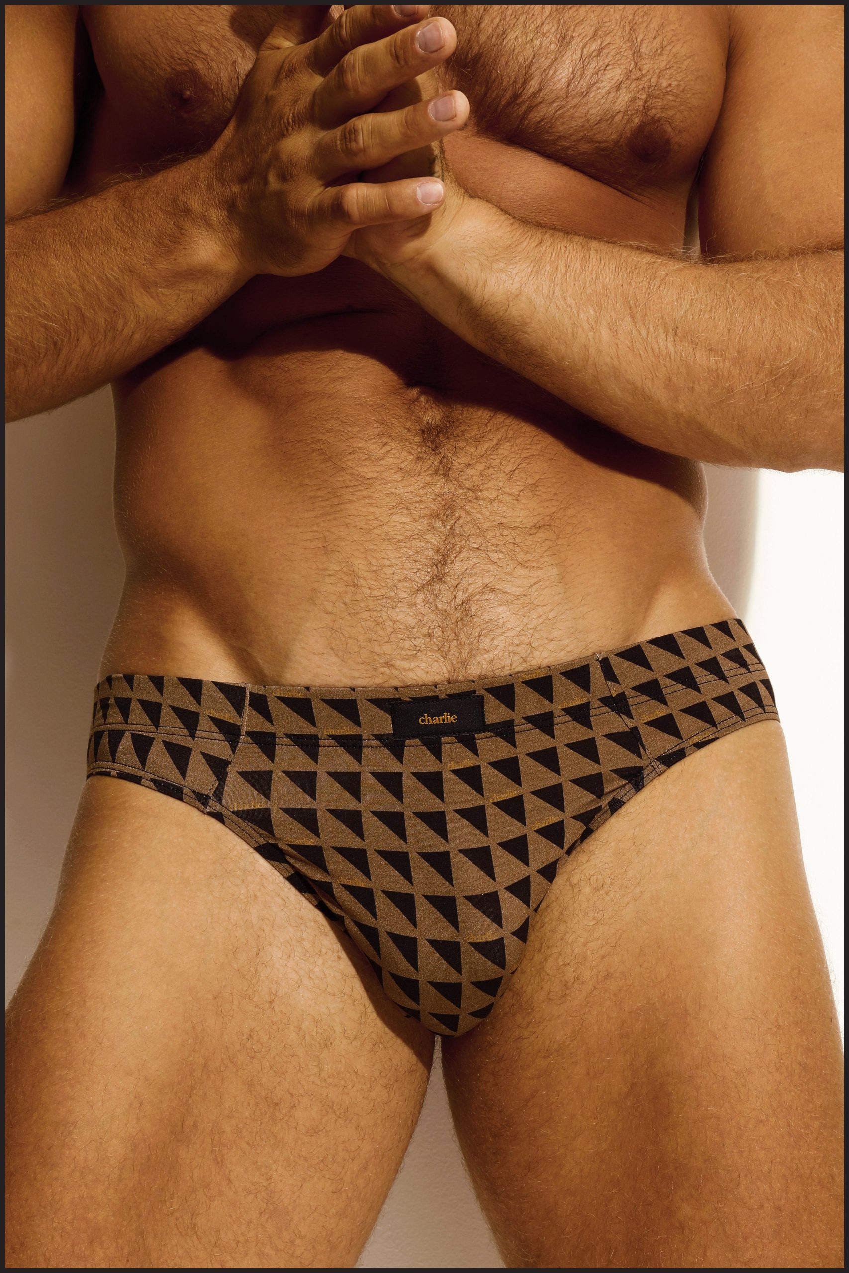 Charlie by Matthew Zink Cafe Icon Geo printed Vintage Brief with 5/8 fabric-covered waist elastic. Single layer front pouch.